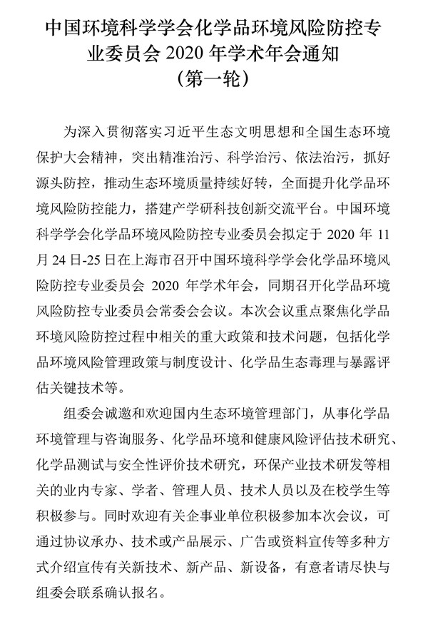 中國環(huán)境科學學會化學品環(huán)境風險防控專業(yè)委員會2020年學術年會通知(第一輪)