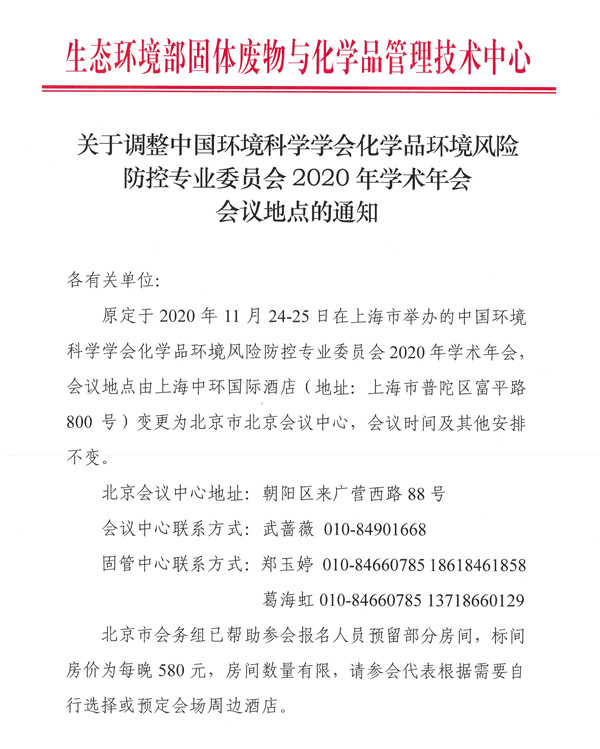 關(guān)于調(diào)整中國(guó)環(huán)境科學(xué)學(xué)會(huì)化學(xué)品環(huán)境風(fēng)險(xiǎn)防控專業(yè)委員會(huì)2020年學(xué)術(shù)年會(huì)會(huì)議地點(diǎn)的通知