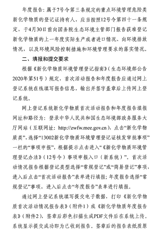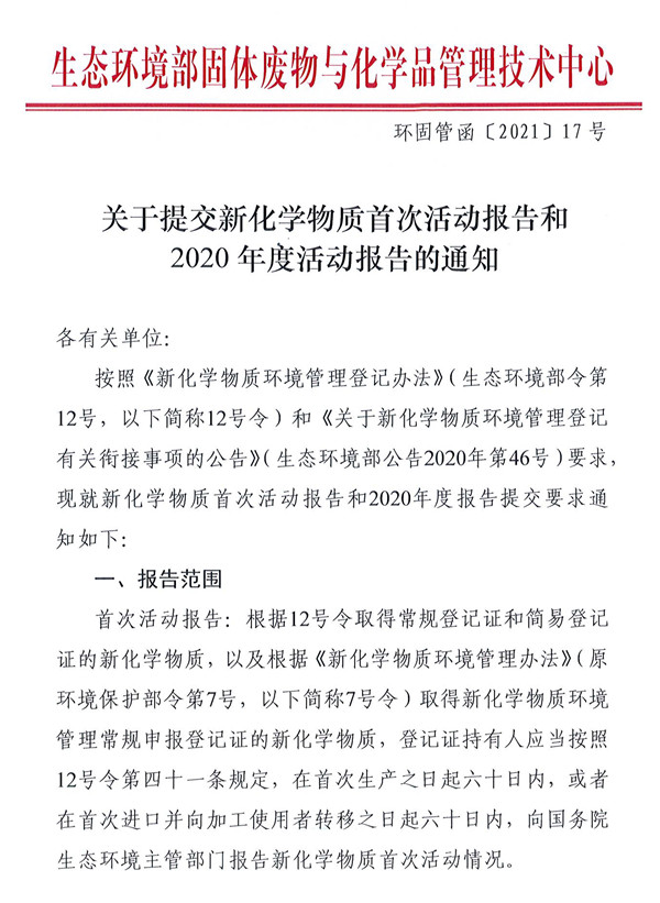 關(guān)于提交新化學(xué)物質(zhì)首次活動報告和2020年度活動報告的通知