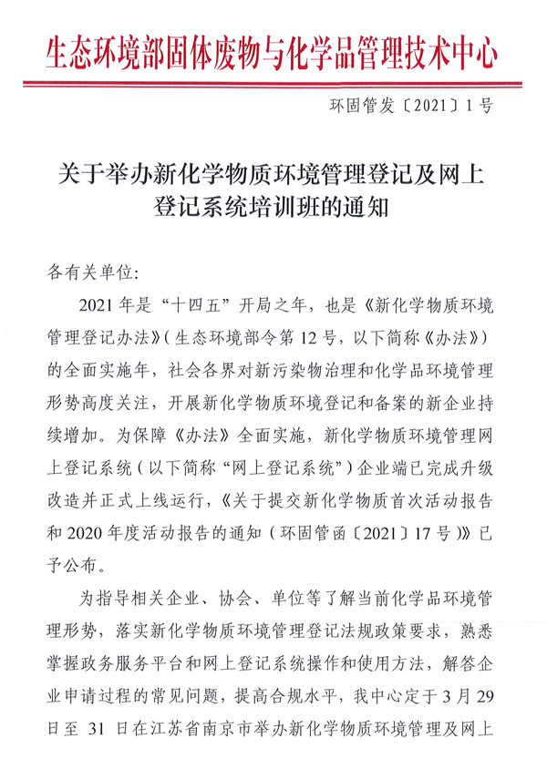 關(guān)于舉辦新化學(xué)物質(zhì)環(huán)境管理登記及網(wǎng)上登記系統(tǒng)培訓(xùn)班的通知