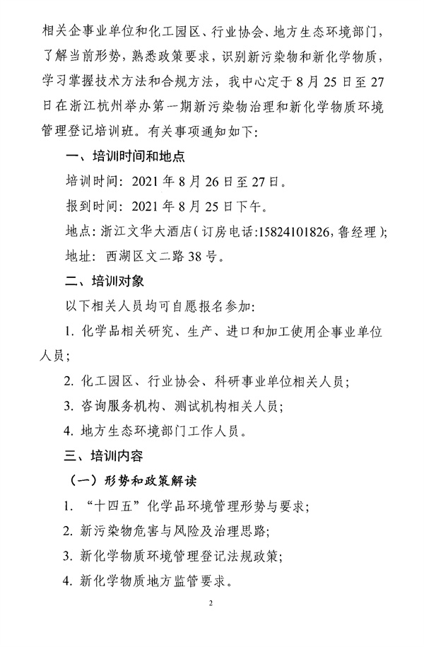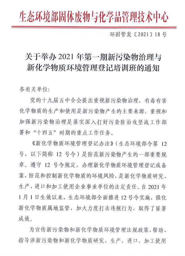 關(guān)于舉辦2021年第一期新污染物治理與新化學物質(zhì)環(huán)境管理登記培訓班的通知